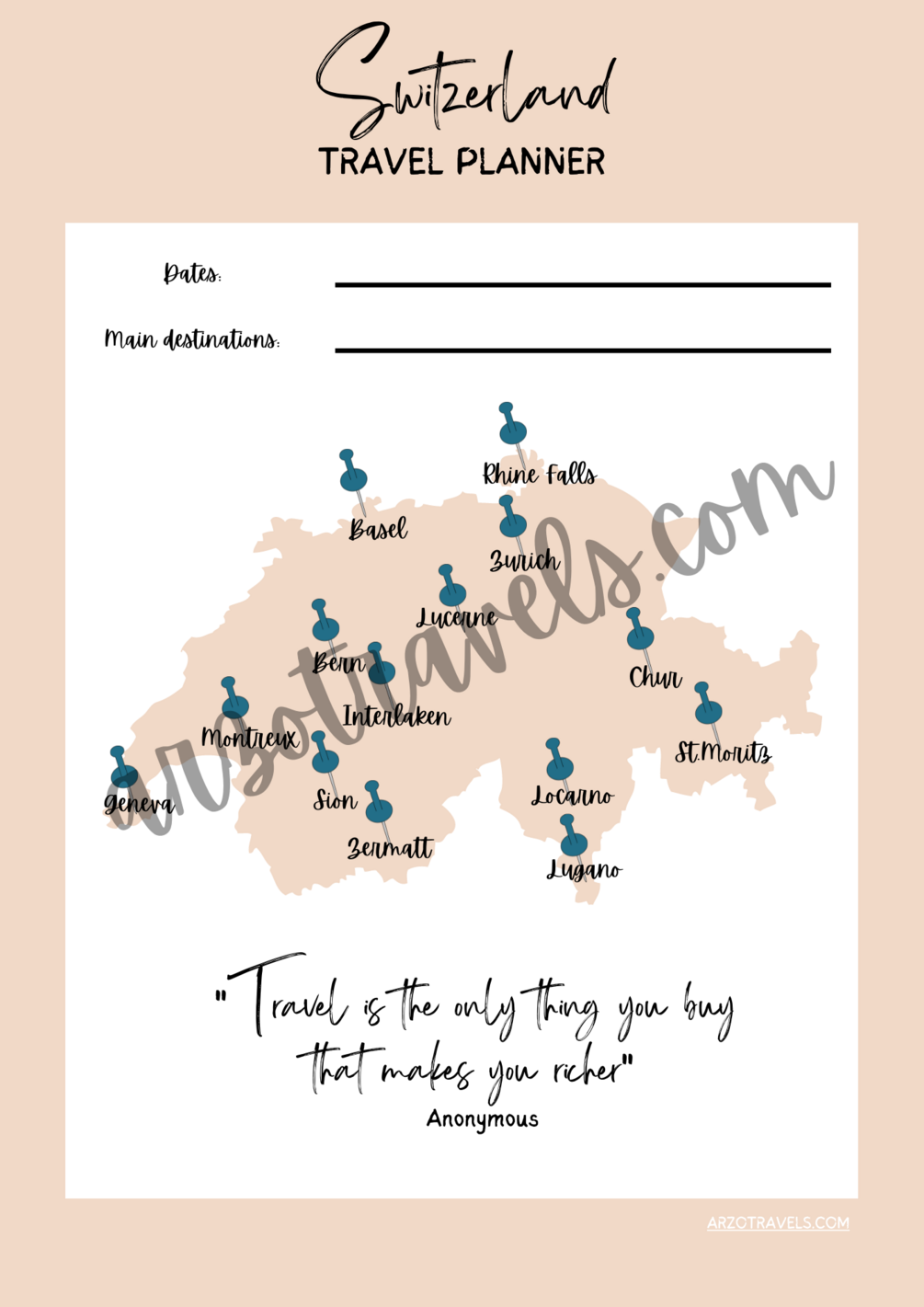 Use this Switzerland travel planner for your itinerary to Switzerland. From a bucket list to daily planners - with this 15-page travel kit, you are well prepared for your Switzerland trip. It is a PDF file and you can print it for your own use as many times as you need it.
